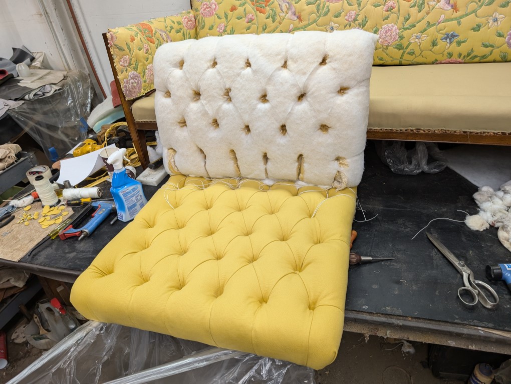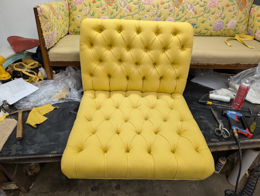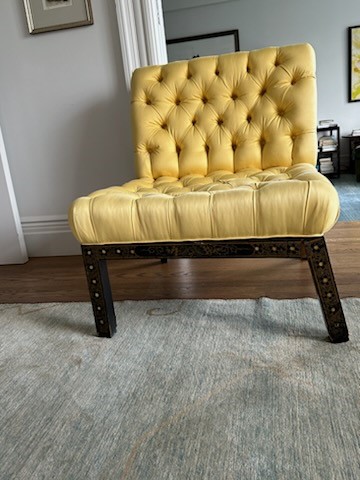 Tufted Chinoiserie and Decorative Finished Chair, and Reupholstering Sofa